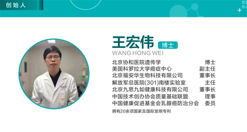 據(jù)代理宣傳,王某偉身上具有多重光環(huán)。他不僅是北京某醫(yī)院遺傳學(xué)博士,還是美國科羅拉大學(xué)癌癥中心副主任、某總醫(yī)院(301)南樓實(shí)驗(yàn)室主任、中國技術(shù)創(chuàng)辦協(xié)會質(zhì)量基礎(chǔ)聯(lián)盟理事、中國健康促進(jìn)基金會乳腺癌防治分會委員,擁有20余項(xiàng)國家及國際發(fā)明專利。
