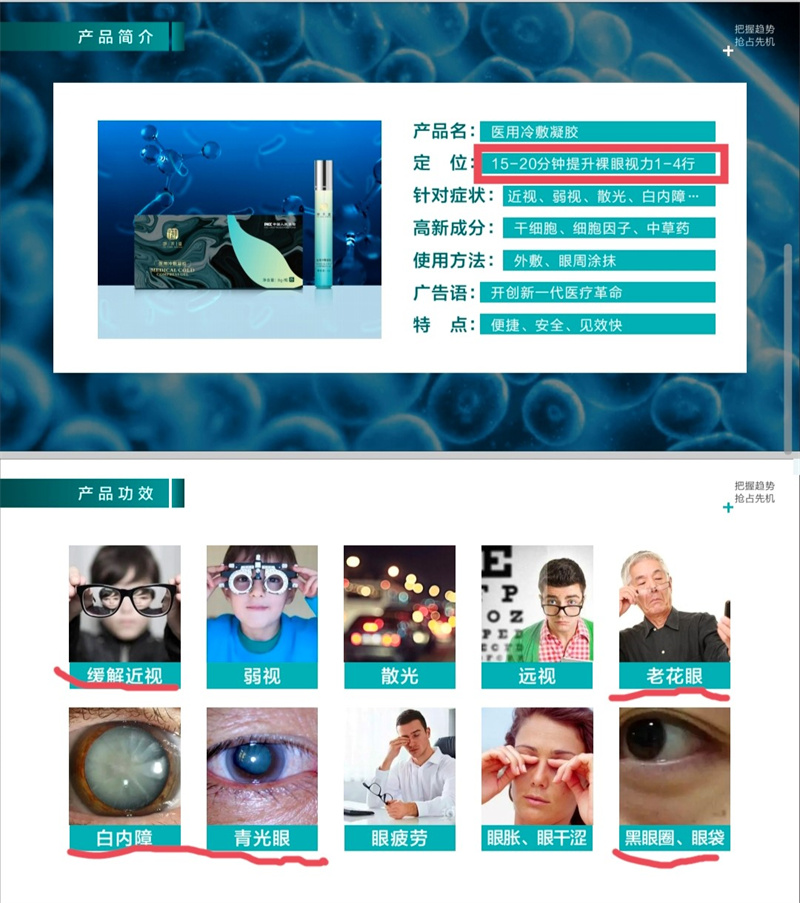 據(jù)代理介紹,“御京盛·醫(yī)用冷敷凝膠”含有密蒙花、谷精草、決明子、野菊花、蒲公英、人工牛黃、薄荷腦、冰片八大核心成分,運(yùn)用干細(xì)胞恒溫存貯技術(shù),中草藥和細(xì)胞因子共同作用,改善、抗衰。產(chǎn)品頭部采用滾珠設(shè)計,只需要打開蓋子,順著眼眶周圍涂抹,然后閉眼休息15分鐘,就可以提升裸眼視力1-4行,緩解眼脹、眼干澀,有效治療近視、弱視、散光等病癥,去除黑眼圈、眼部細(xì)紋、改善青光眼、白內(nèi)障、老花眼、飛紋眼等眼疾。但該產(chǎn)品的效果真的有其所宣傳的那么神奇嗎?
