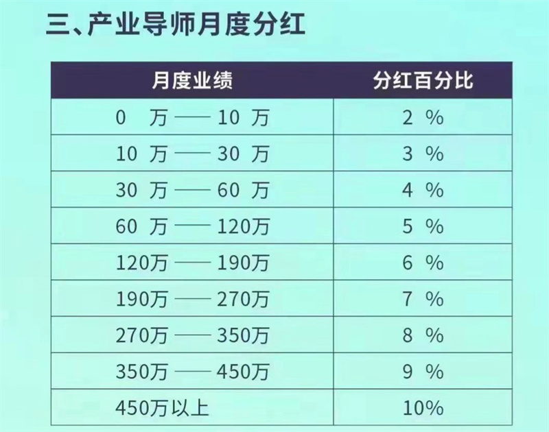 團(tuán)隊(duì)業(yè)績分紅獎勵:產(chǎn)業(yè)導(dǎo)師的團(tuán)隊(duì)月總業(yè)績在0~10萬之間,可獲得團(tuán)隊(duì)月總業(yè)績2%的分紅;團(tuán)隊(duì)月總業(yè)績在10~30萬之間,可獲得團(tuán)隊(duì)月總業(yè)績3%的分紅;團(tuán)隊(duì)月總業(yè)績在30~60萬之間,可獲得團(tuán)隊(duì)月總業(yè)績4%的分紅;團(tuán)隊(duì)月總業(yè)績在60~120萬之間,可獲得團(tuán)隊(duì)月總業(yè)績5%的分紅;團(tuán)隊(duì)月總業(yè)績在120~190萬之間,可獲得團(tuán)隊(duì)月總業(yè)績6%的分紅;團(tuán)隊(duì)月總業(yè)績在190~270萬之間,可獲得團(tuán)隊(duì)月總業(yè)績7%的分紅;團(tuán)隊(duì)月總業(yè)績在270~350萬之間,可獲得團(tuán)隊(duì)月總業(yè)績8%的分紅;團(tuán)隊(duì)月總業(yè)績在350~450萬之間,可獲得團(tuán)隊(duì)月總業(yè)績9%的分紅;團(tuán)隊(duì)月總業(yè)績超過450萬,可獲得團(tuán)隊(duì)月總業(yè)績10%的分紅。
