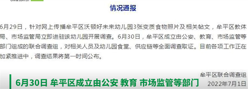 中國(guó)民生新聞網(wǎng)訊 7月1日,山東煙臺(tái)。牟平區(qū)通報(bào)“沃頓好未來(lái)幼兒園被指食物變質(zhì)”:已進(jìn)駐該幼兒園調(diào)查。6月30日成立聯(lián)合調(diào)查組,對(duì)相關(guān)人員及幼兒園食堂、供應(yīng)鏈等調(diào)查取證。
