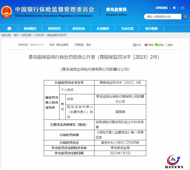 因違規(guī)收取保險代理合同約定之外的手續(xù)費,青島銀保監(jiān)局對青島誠信達保險代理有限公司即墨分公司及其法定代表人聶麗娟給予警告并罰款。