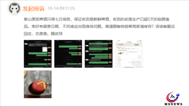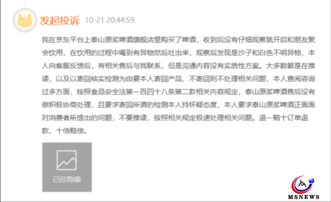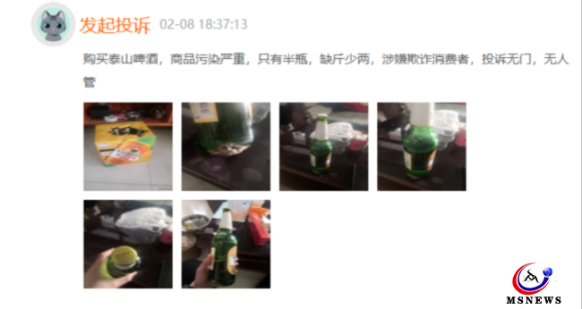 一位消費者2月8日投訴稱,購買泰山啤酒,商品污染嚴重,只有半瓶,缺斤少兩,涉嫌欺詐消費者,投訴無門,無人管。其后該消費者補充了3次投訴信息,截至目前,該投訴僅停留在3月21日的泰山原漿啤酒回復,該條投訴仍在繼續(xù)。