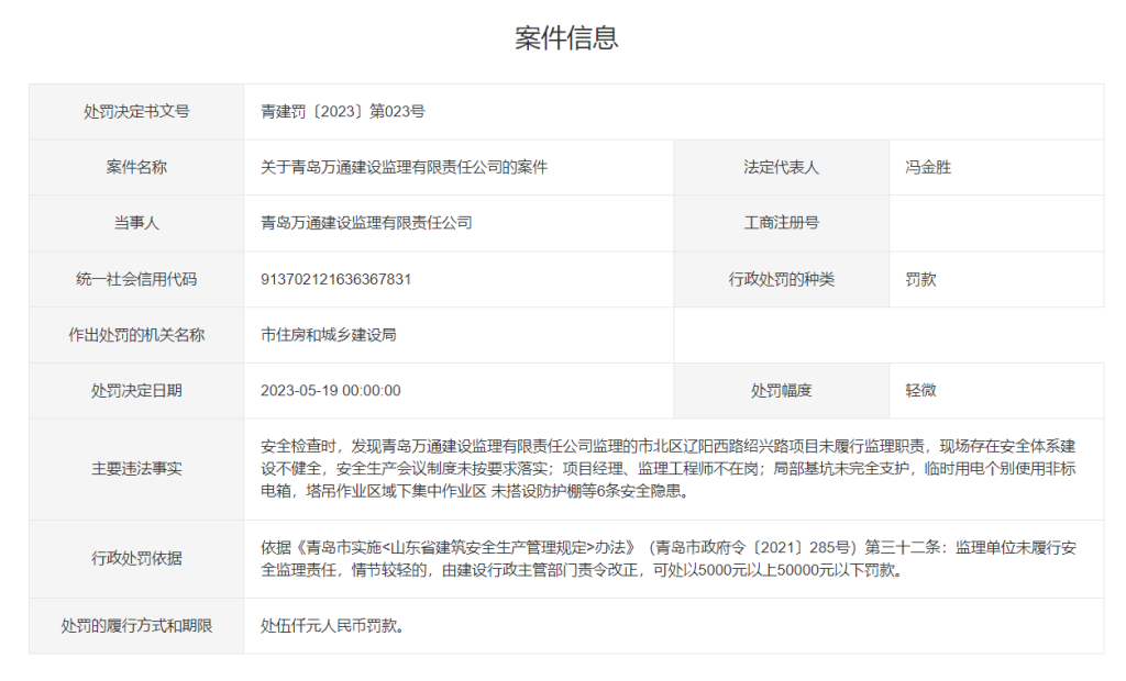 同時,青島市行政處罰與行政強制信息公示平臺還公示了青建罰〔2023〕第023號處罰決定書關(guān)于青島萬通建設(shè)監(jiān)理有限責(zé)任公司的案件,案件顯示主要違法事實為:安全檢查時,發(fā)現(xiàn)青島萬通建設(shè)監(jiān)理有限責(zé)任公司監(jiān)理的市北區(qū)遼陽西路紹興路項目未履行監(jiān)理職責(zé),現(xiàn)場存在安全體系建設(shè)不健全,安全生產(chǎn)會議制度未按要求落實;項目經(jīng)理、監(jiān)理工程師不在崗;局部基坑未完全支護,臨時用電個別使用非標(biāo)電箱,塔吊作業(yè)區(qū)域下集中作業(yè)區(qū) 未搭設(shè)防護棚等6條安全隱患。