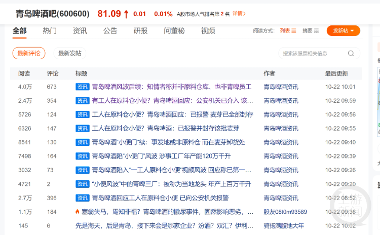 10月22日,“青島啤酒”在東財(cái)個股人氣榜中排名第二。網(wǎng)上搜索發(fā)現(xiàn),“史上最貴的一泡尿”“這一泡尿市值上億”等,成為網(wǎng)絡(luò)熱詞,有多篇文章分析“小便門”對企業(yè)可能造成的影響。