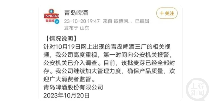 10月20日,青島啤酒發(fā)布情況說明稱,針對10月19日網(wǎng)上出現(xiàn)的青島啤酒三廠的相關(guān)視頻,該公司高度重視,第一時間向公安機(jī)關(guān)報(bào)警,公安機(jī)關(guān)已介入調(diào)查。目前,該批麥芽已經(jīng)全部封存。該公司將繼續(xù)加大管理力度,確保產(chǎn)品質(zhì)量,歡迎廣大消費(fèi)者監(jiān)督。