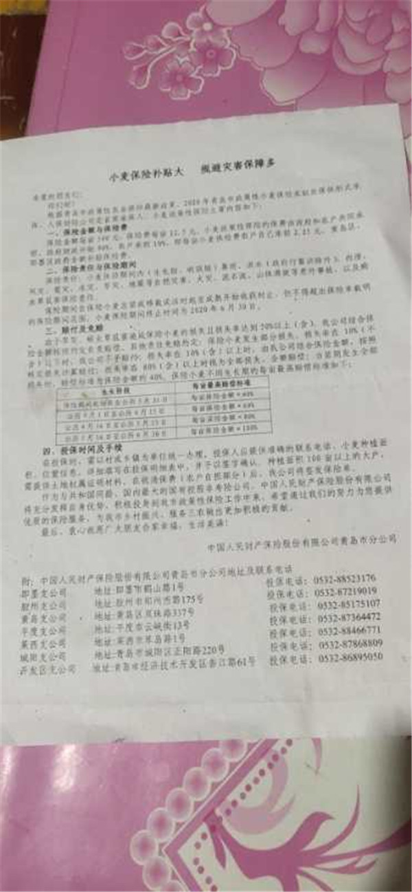 8月25日上午,記者來(lái)到了位于萊西市上海中路和長(zhǎng)島路路口西北側(cè)的中國(guó)人保萊西支公司,經(jīng)過(guò)辦公室一位女性工作人員聯(lián)系后,確認(rèn)負(fù)責(zé)馬連莊鎮(zhèn)的小麥保險(xiǎn)的負(fù)責(zé)人不在公司,請(qǐng)記者將需要了解的問(wèn)題留下等她轉(zhuǎn)達(dá)后回復(fù)。記者就呂家草泊村的小麥保險(xiǎn)理賠留下幾個(gè)問(wèn)題:1、為何連成片的好幾個(gè)村莊的小麥保險(xiǎn)理賠會(huì)出現(xiàn)兩個(gè)標(biāo)準(zhǔn)?125元/畝的理賠依據(jù)是什么?2、為何不把保單給村民?既然收4.5元/畝保兩季,那玉米保險(xiǎn)的保單在哪里?3、呂家草泊村的種糧大戶打完電話后就更改了理賠標(biāo)準(zhǔn),有沒有這回事?如果有是為什么?隨后記者離開了該公司,但是直到記者發(fā)稿前沒有接到該公司的任何回復(fù)。
