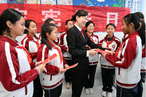 “同學(xué)們,你們知道我們國家的基本法律有哪些嗎?我們國家的根本法是什么呢?”法官們用提問問題的方式吸引學(xué)生們的注意,通過列舉具體的案例,讓學(xué)生們了解憲法是如何保護公民的,引導(dǎo)學(xué)生們從小樹立憲法意識、自覺維護憲法權(quán)威。