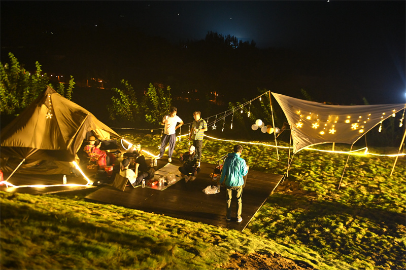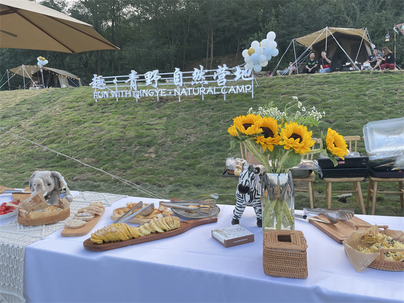 記者沉浸式體驗(yàn)趣·青野 自然營地,晴朗的天空,唯美的夕陽,天幕帳篷襯著暖暖的燈光,花草點(diǎn)綴,桌上都是滿滿的美食,圍坐在帳篷下,望著藍(lán)天白云,一邊吃著愛心蛋糕,一邊喝著香醇的咖啡,簡直就是童話中的場景。