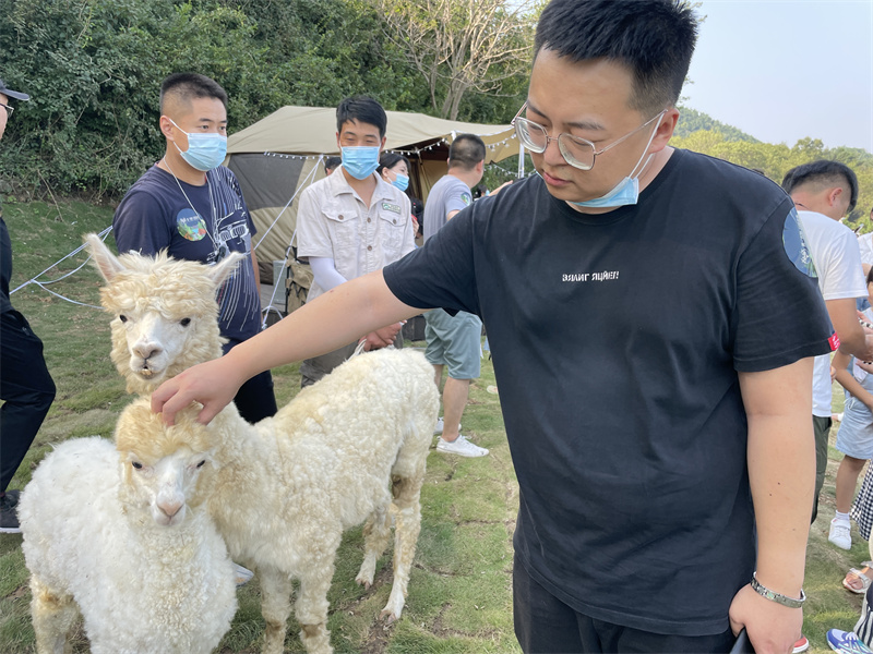 記者現(xiàn)場看到趣·青野 自然營地設(shè)立在青島森林野生動物世界亞洲區(qū),與萌寵動物零距離,清晨,小鹿從身邊經(jīng)過,下午,與羊駝共進(jìn)茶點(diǎn),與溪邊黑天鵝嬉戲……夜晚,仰望星空,聆聽自然,與動物共度美好時光。