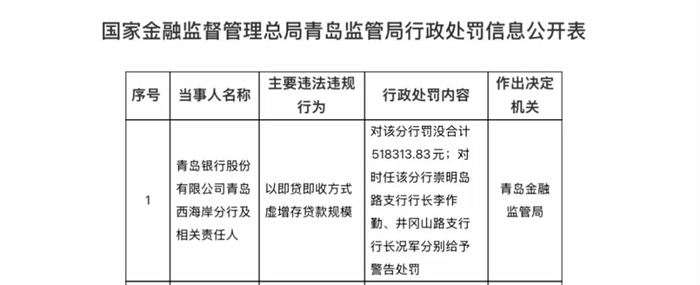 國家金融監(jiān)督管理總局網(wǎng)站近日發(fā)布的青島監(jiān)管局行政處罰信息公開表顯示,青島銀行股份有限公司青島西海岸分行及相關(guān)責(zé)任人通過“即貸即收”的操作虛增存貸款規(guī)模,最終被處以罰沒超51萬元的處罰,對時任該分行崇明島路支行行長李作勤、井岡山路支行行長況軍分別給予警告處罰。